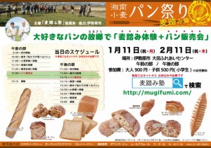 「湘南小麦パン祭り」 in 伊勢原 投稿日時: 2016年1月8日 投稿者: admin 1月11日(祝) 「湘南小麦パン祭り」を開催します! → http://mugifumi.com/event_3.html 都内有名シェフが湘南小麦を使って焼いたパンが 伊勢原に集結 ル・ルソール、ガーデンハウスクラフツ、麦神、ラ・テール、ポワンタージ,タルイベーカリー、ニコ、ムールアラムールほか (1月11日の午後の部に若干お席がございます)
